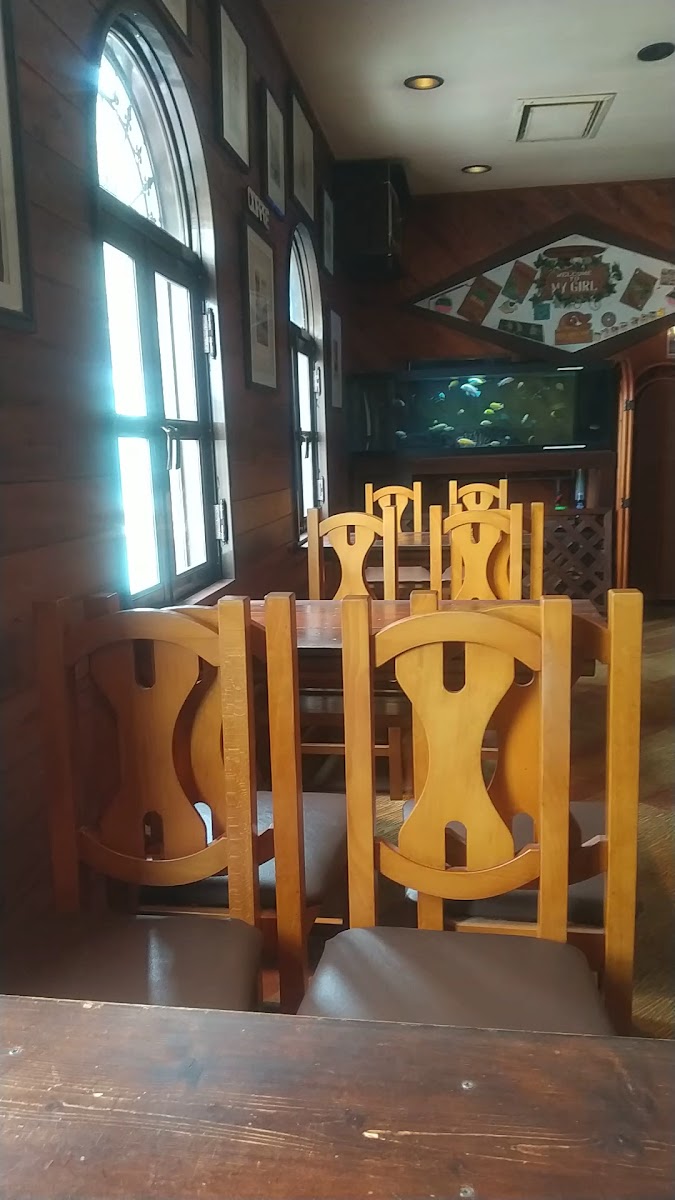 As you make your way up the steep staircase to the second floor, you're greeted by a cozy atmosphere that feels like a warm embrace. The air is filled with soft melodies that transport you back in time, complemented by the gentle sound of vibrant fish swimming in an aquarium tucked away in the back corner. The inviting ambiance is perfect for those looking to unwind and escape the hustle and bustle of everyday life.
